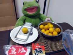 先週買ってきた柚子を使って柚子胡椒を仕込みましたよ〜。一個10円の小さな柚子だったけど、果汁も多かったので、皮を削いだ実は冷凍しておいて、焼酎の柚子お湯割りにしようと思いますー