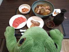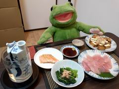 今夜はちょっと肌寒いので、あったかなめこ豆腐、縞ホッケ干物焼き、小松菜のおひたしで日本酒冷やですー