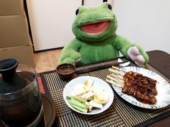 今夜は業務スーパーで買ってきた198円で5本入りの鶏皮焼き鳥と、かぶの浅漬に味の素と醤油をちょろっと垂らして、麦焼酎の熱燗ですよ〜。焼き鳥はタレだくなので、古典落語の初天神みたいに、タレをたっぷり付けて食べましたー