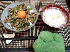 シメは蕪の葉とひき肉のそぼろふりかけに卵黄をのせて〜。あとは白身かき玉汁ですよー。そぼろふりかけは濃い味が好きなので豚挽き肉倍量、おろし生姜と砂糖追加、追い胡麻油で仕上げています〜。蕪や大根の葉や茎で作れて美味しいので、お勧めでですよー