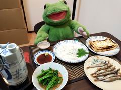 今夜はエンガワのお刺身、樺太シシャモ、油揚げ焼き、菜の花の辛子和えで熱燗ですよー。樺太シシャモは120円だったのでカペリンだと思います〜