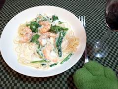 今夜は合鴨ロース、フロマージュシトラス、サーモンチーズで赤ワイン〜。シメは海老と菜の花のクリームパスタですよー