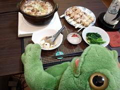 今夜はあったかなめこ豆腐、塩焼鳥盛り合わせ、菜の花の辛子和えで熱燗ですよー