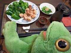 今夜は塩つくね+生ピーマン、芹のおひたしで麦焼酎割の熱燗ですー