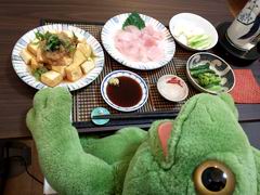 今夜はビンチョウ鮪のお刺身、焼き厚揚げの大根おろしがけ、菜の花の辛子和え、かぶの浅漬で熱燗ですよ〜。焼き厚揚げの大根おろしがけは初めて作ってみたけど、美味しいので定番にしようと思いますー