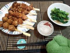 今夜は焼き鳥盛り合わせ、菜の花の辛子和えで熱燗〜。シメは焼き塩鮭と豚汁で炊きたてご飯ですよー