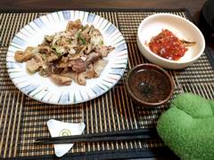 今夜はねぎ塩もつ焼き、キムチで麦焼酎割の熱燗〜。シメはぶなしめじと豚こまの柚子胡椒パスタですよー