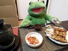 今夜は焼き鳥たれ焼き盛り合わせ、キムチで麦焼酎割の熱燗ですよ〜