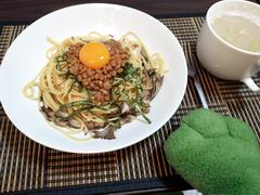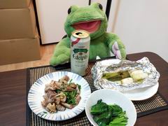 今夜はねぎ塩モツ焼き、上州ネギと舞茸のバターホイル焼き、のらぼう菜のおひたしで、エーデルピルスです〜。シメは舞茸納豆パスタ、白身掻き玉スープですよー