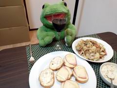 今夜はマスタードとクミンシードを効かせたジャーマンポテト、薄切りバタールにハムチーズ、刻みハム&玉葱のマスタードマヨのせで赤ワインです〜