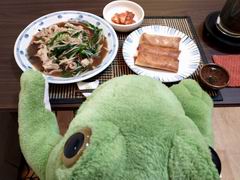 今夜はレバニラ炒めのレシピで肉ニラ炒め、海老五目春巻き、キムチで麦焼酎割の熱燗ですよー