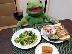 今夜はブロッコリーと卵のふわふわマヨ炒め、買ってきたのだけどクリームコロッケ、軽く焼いた薄切りバタールにアボカドペーストとソーセージをのせて赤ワインですよ〜