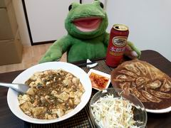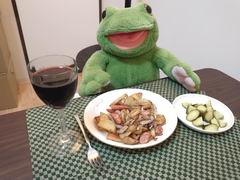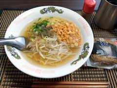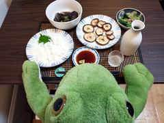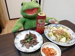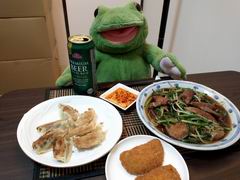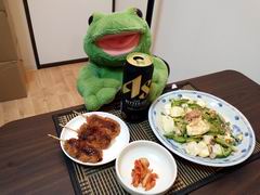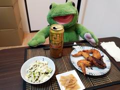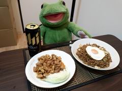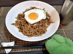 お昼は久しぶりに、うどんスープに中華麺の鳥取素ラーメン〜。天かすと胡椒が必須で、ラーメンを食べているような錯覚を起こす味ですよー。夜はフライドオニオン入りソース焼きそば ういず目玉焼き、焼鳥屋さんの鶏皮でいっぱいです〜