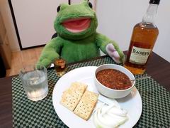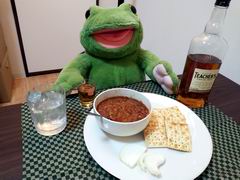 今夜はあるもんデー。作り置きのチリコンカンにクラッカーと生玉ねぎを添えてウィスキーストレート〜。シメはナポリタンですよー