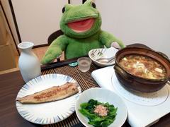 今夜はちょっと肌寒いので、あったかなめこ豆腐、縞ホッケ干物焼き、小松菜のおひたしで日本酒冷やですー