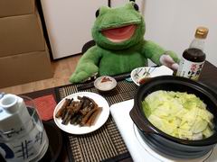 今夜は白い白菜鍋に自家製柚子胡椒をそえて〜。あとは鯨ユッケで麦焼酎割の熱燗ですよー。シメはごはんとチーズを入れてリゾットにしました〜